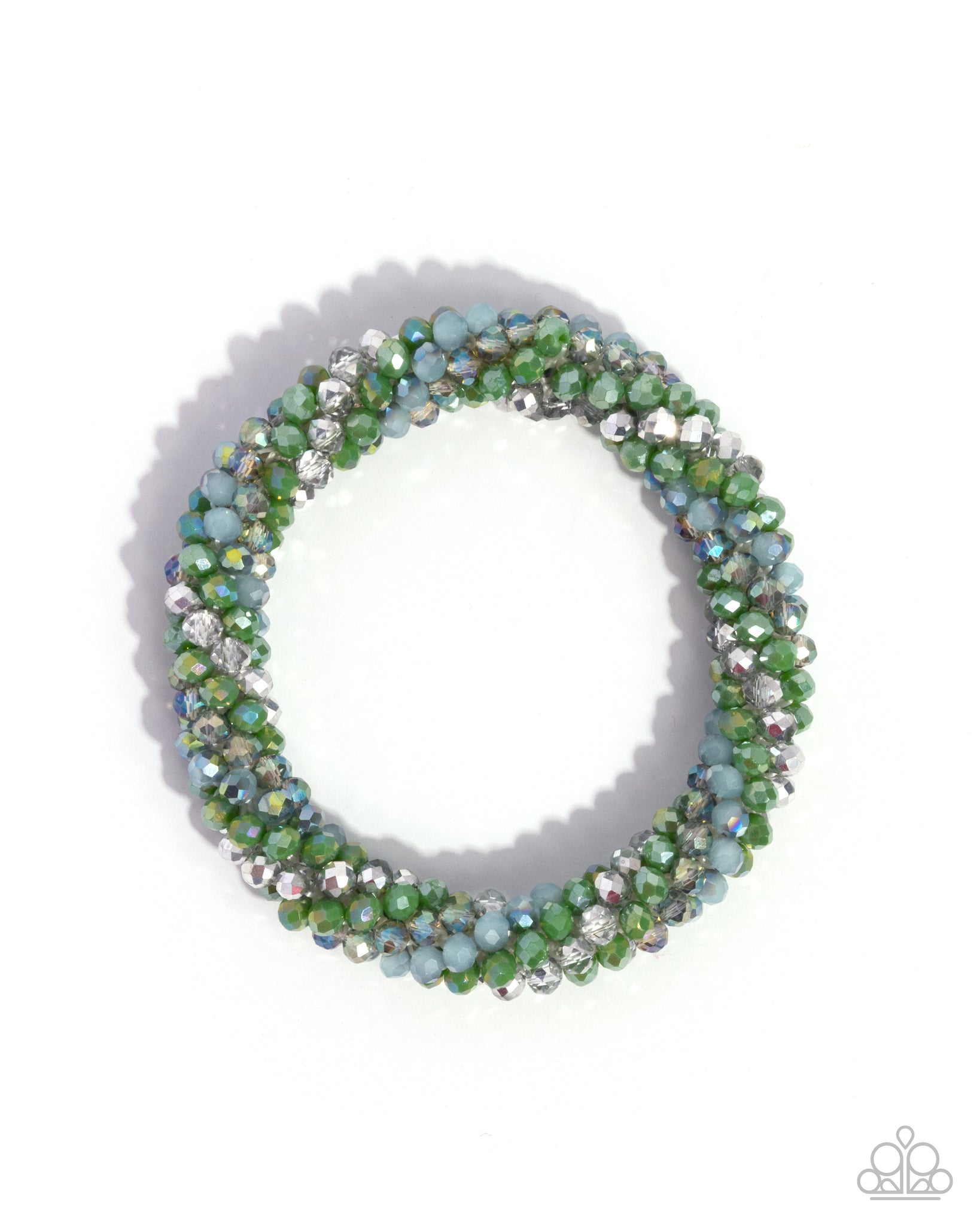 A swirl of small faceted beads in refreshing shades of green, airy blue, iridescent blue, and reflective silver are woven into a rope-like band around the wrist, creating a sparkling pop of color with every turn. Due to its prismatic palette, color may vary.