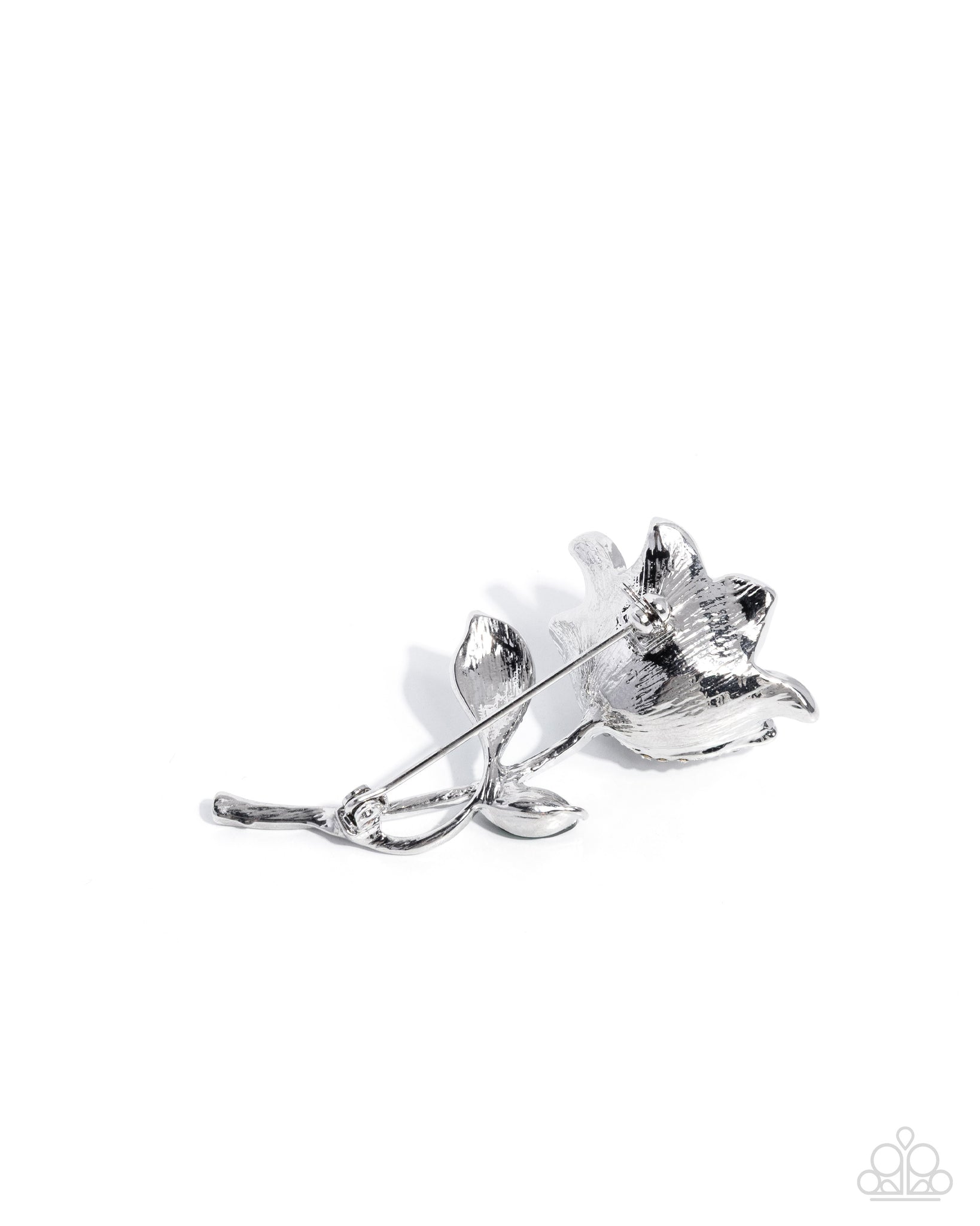 Featuring mismatched silver leaves of green rhinestones and an emerald marquise-cut gem, a white rhinestone-embellished curly silver flower with a metallic deep red-painted interior curls around a glossy white pearl center for a wildly whimsical display. Brooch measures approximately 1" in length and 2 1/2" in width.