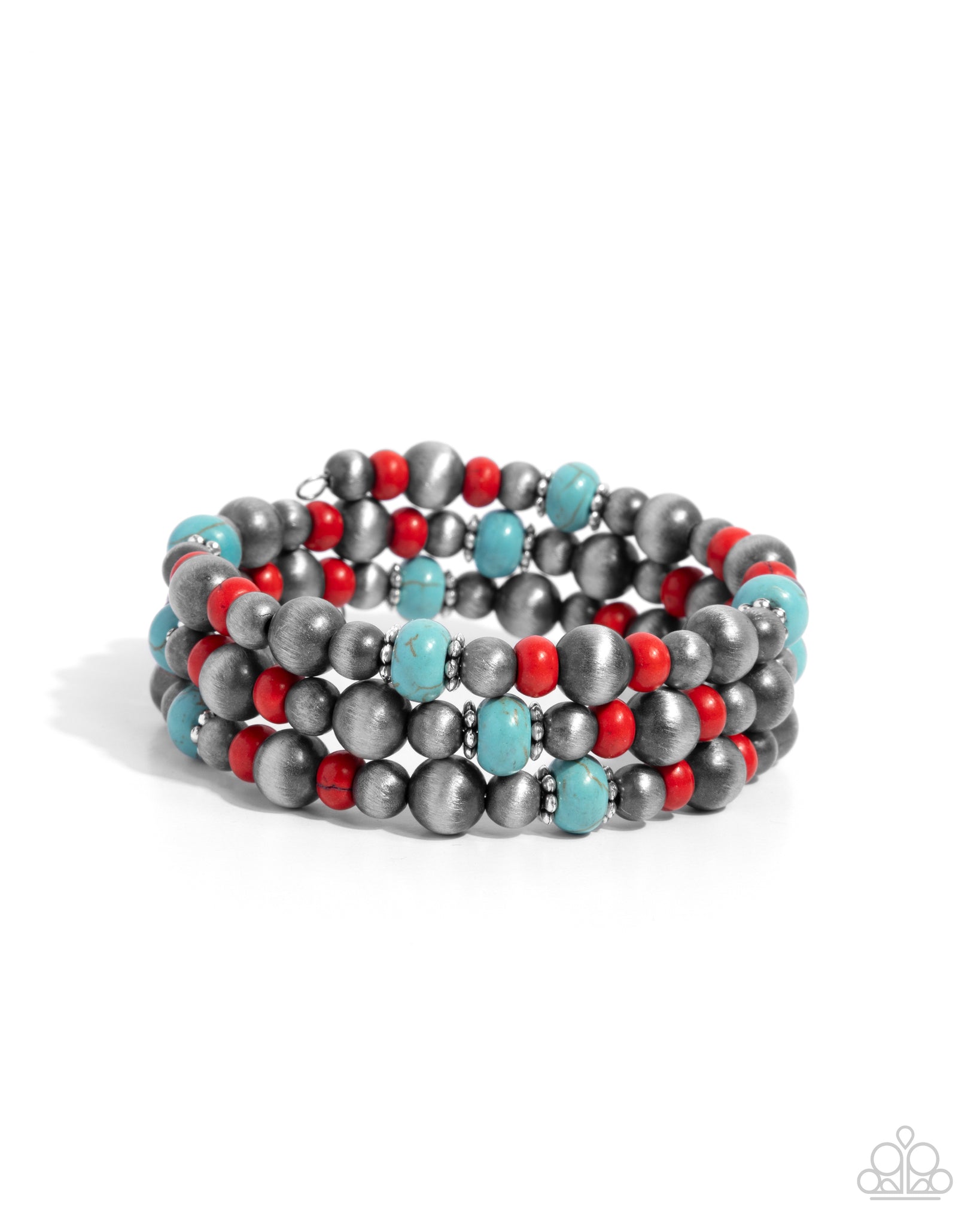 Threaded along a coiled wire, a collection of silver floral beads, turquoise stone discs, Navajo pearls in varying sizes, and red stone discs loop along the wrist in a sassy Southwestern pattern creating an earthy infinity wrap-style bracelet. As the stone elements in this piece are natural, some color variation is normal.