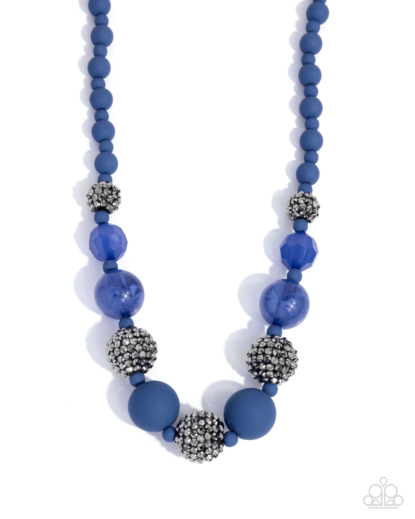 A blend of matte blue beads, faceted cobalt accents, and oversized marbled blue beads is interspersed with dazzling hematite-encrusted spheres along the neckline. The vibrant blue tones and intricate beadwork create a bold yet elegant statement. Features an adjustable clasp closure.