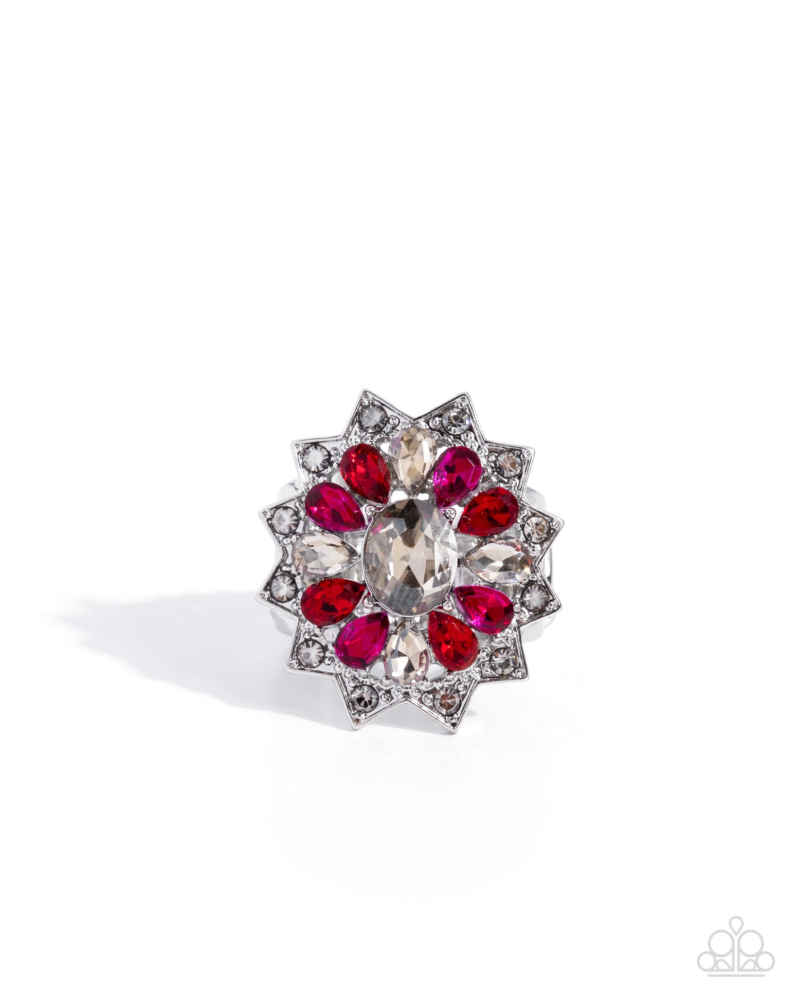 Featuring smoky rhinestones, spiky silver petals bloom around a faceted smoky gem center, showcasing the smaller floral arrangement of red and smoky teardrop gem petals atop the finger for a whimsically radiant statement. Features a stretchy band for a flexible fit.