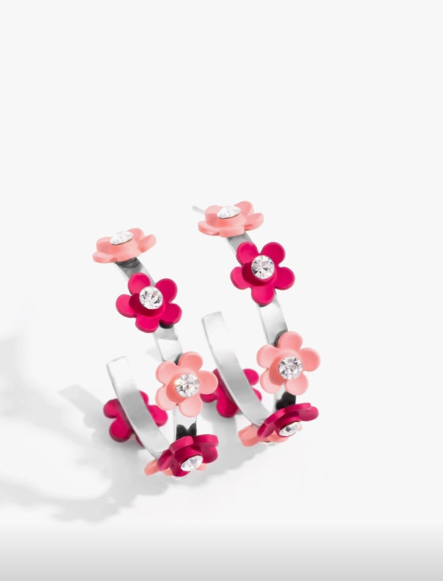 The front of a high-sheen silver hoop is encrusted in alternating Peach Pink and pink clay flowers with white rhinestone centers to create a fashionable hoop. Earring attaches to a standard post fitting. Hoop measures approximately 1 1/s' in diameter. Sold as one pair of earrings