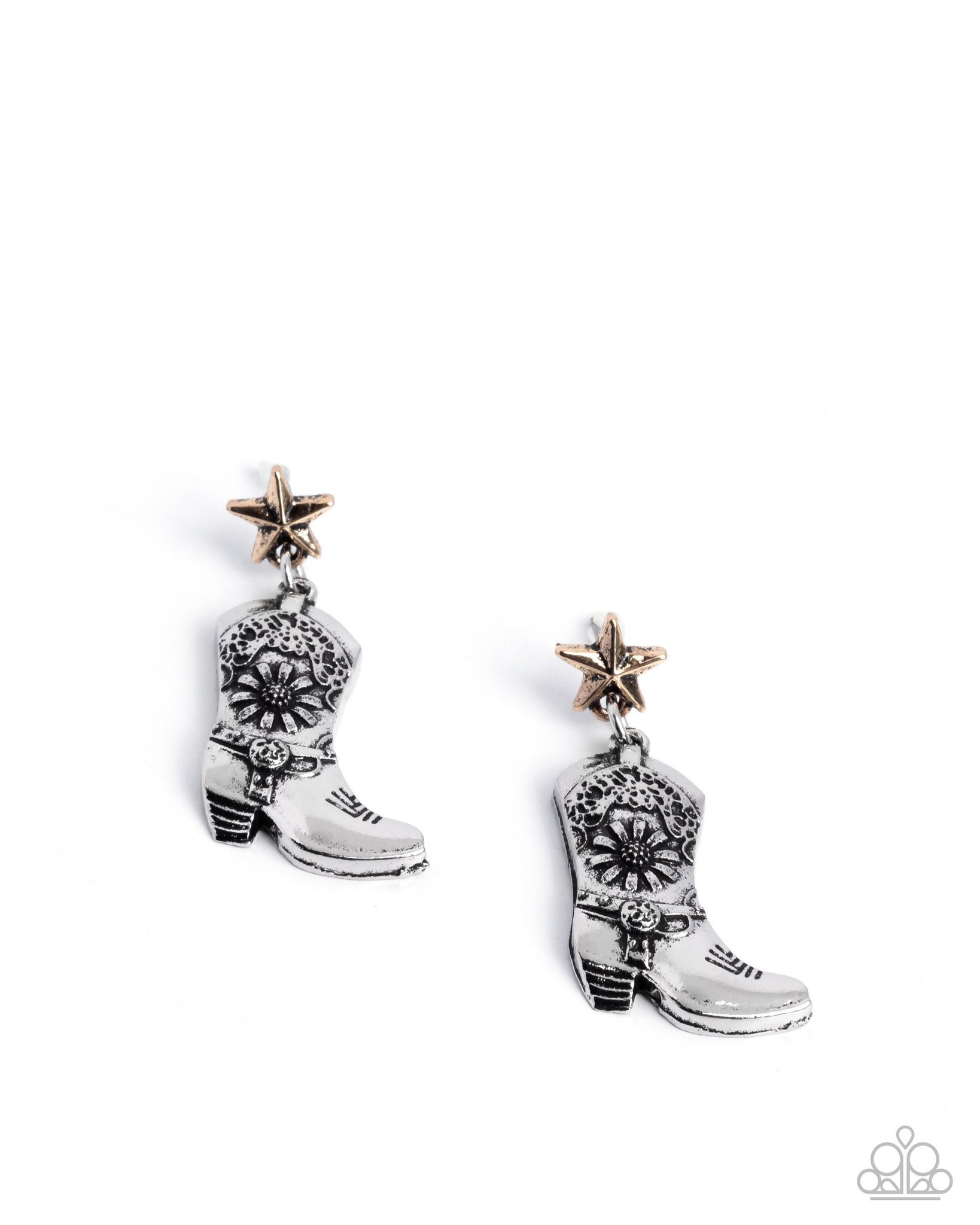 Featuring tactile texture, an antiqued gold sheriff star-inspired post gives way to a silver sunflower-embellished cowboy boot, which do-si-dos below the ear for a whimsical Western lure. Earring attaches to a standard post fitting.