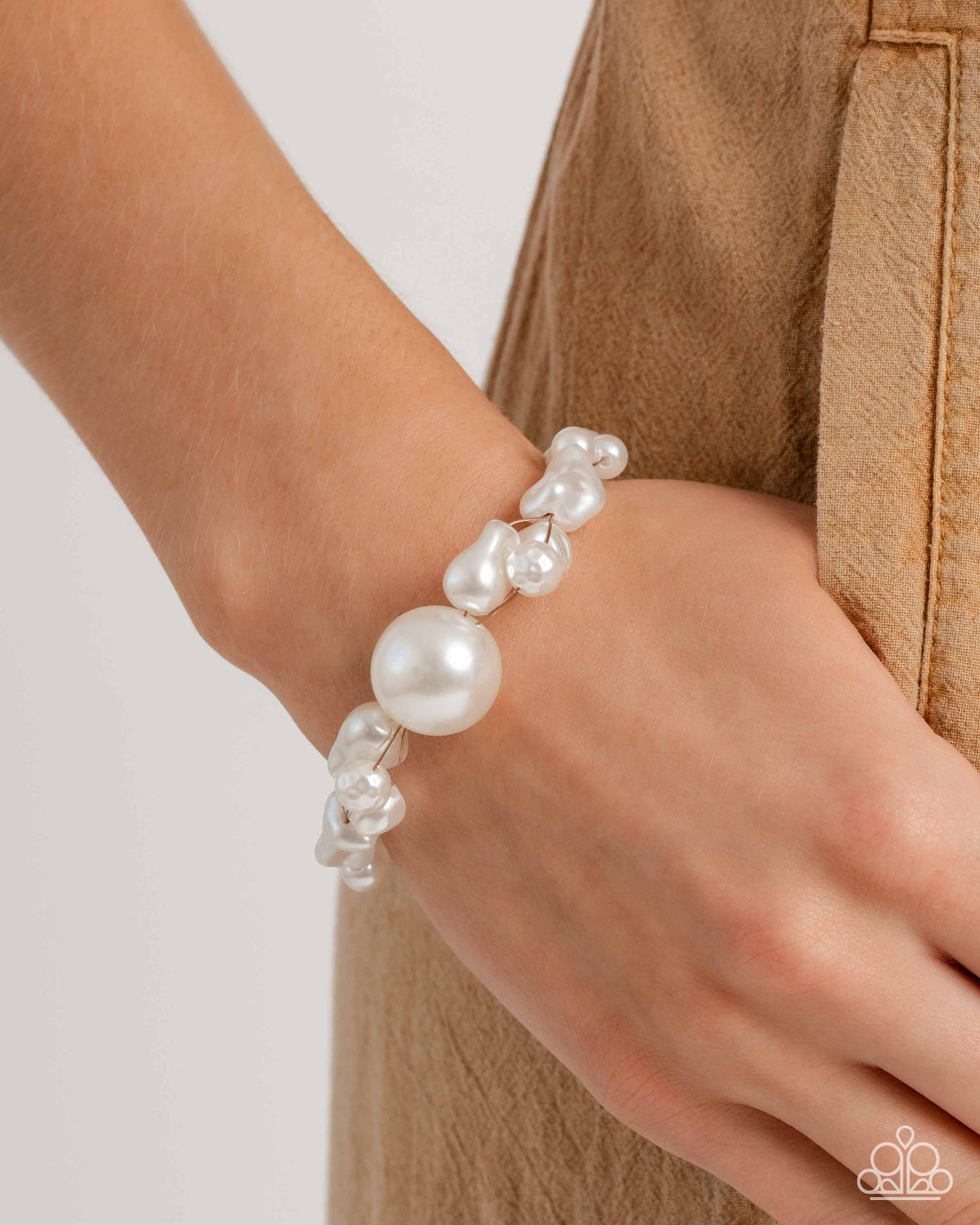Infused along a trio of dainty copper wires, a collection of classic and baroque white pearls in varying sizes coalesce around the wrist, leading the eye to an oversized round white pearl for an opulent, refined centerpiece. Features an adjustable clasp closure.